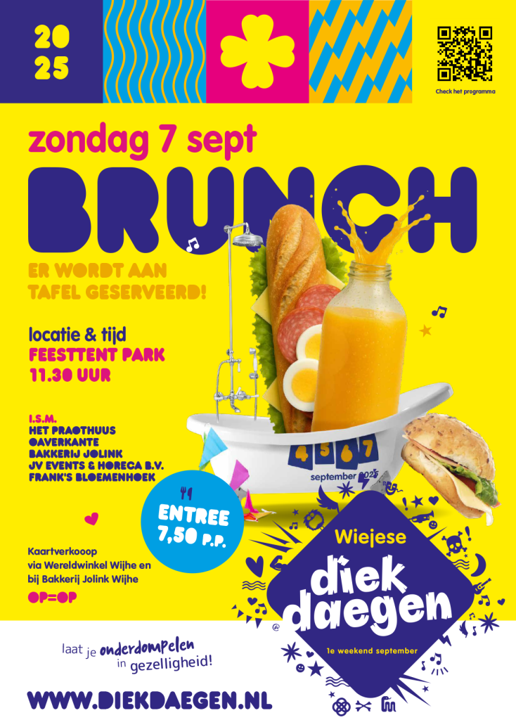 Vanaf woensdag 20 augustus start kaartverkoop voor de brunch op zondag 7 september. De kaarten zijn te koop bij Bakkerij Jolink en De Wereld Winkel in de Langstraat in Wijhe.