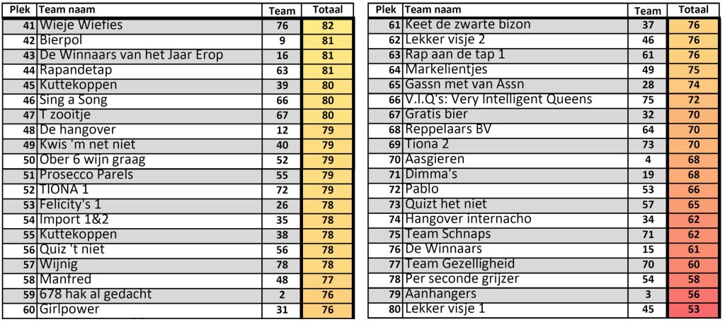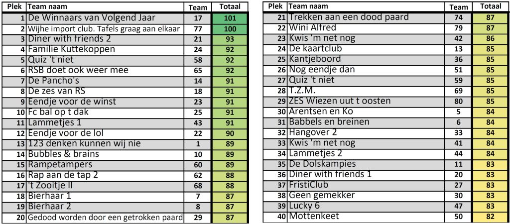 Alle punten voor de PubQuiz zijn nauwkeurig bijgehouden. Check hieronder jullie positie zodat je weet hoe goed je aan de studie moet voor volgend jaar!